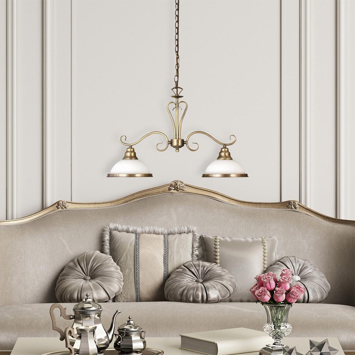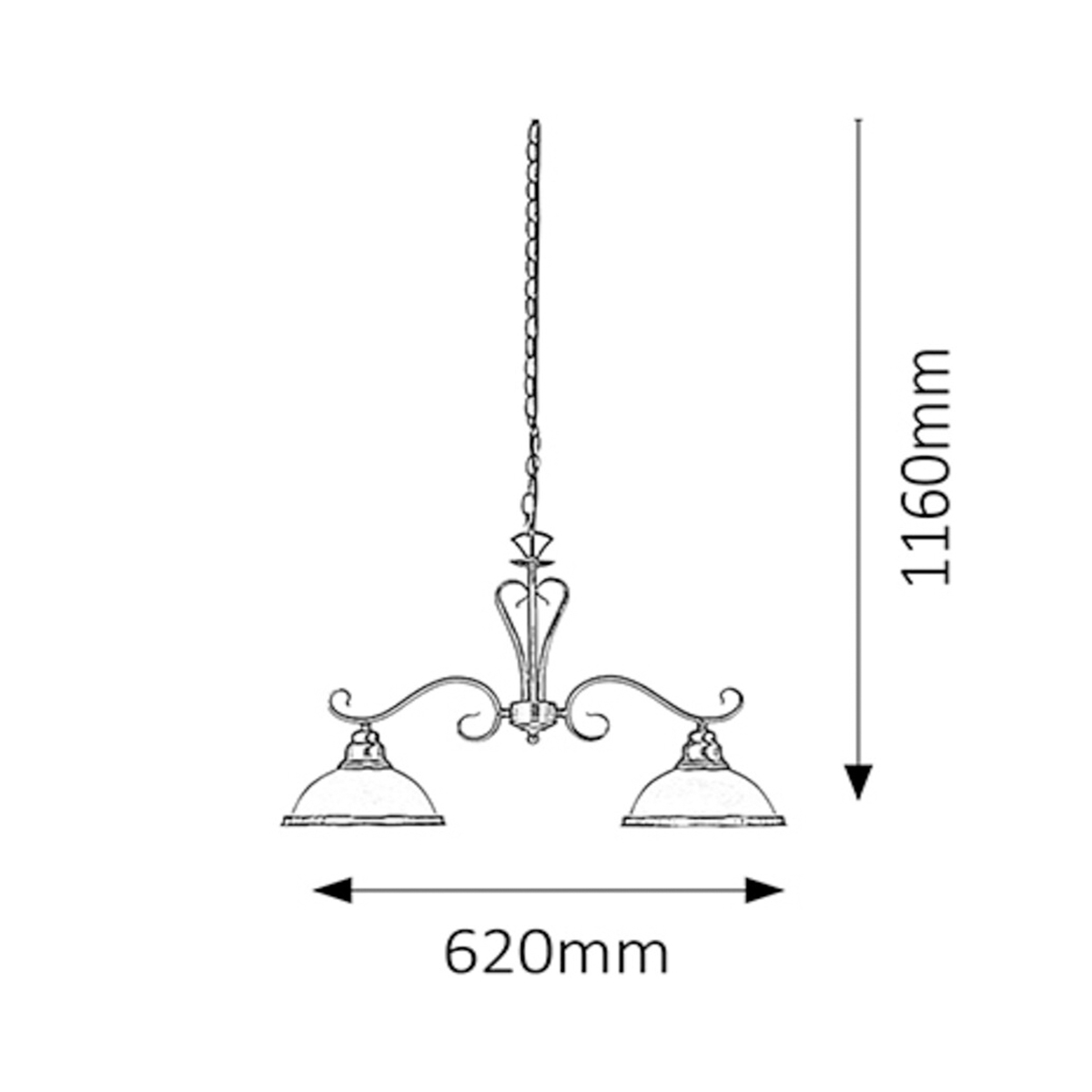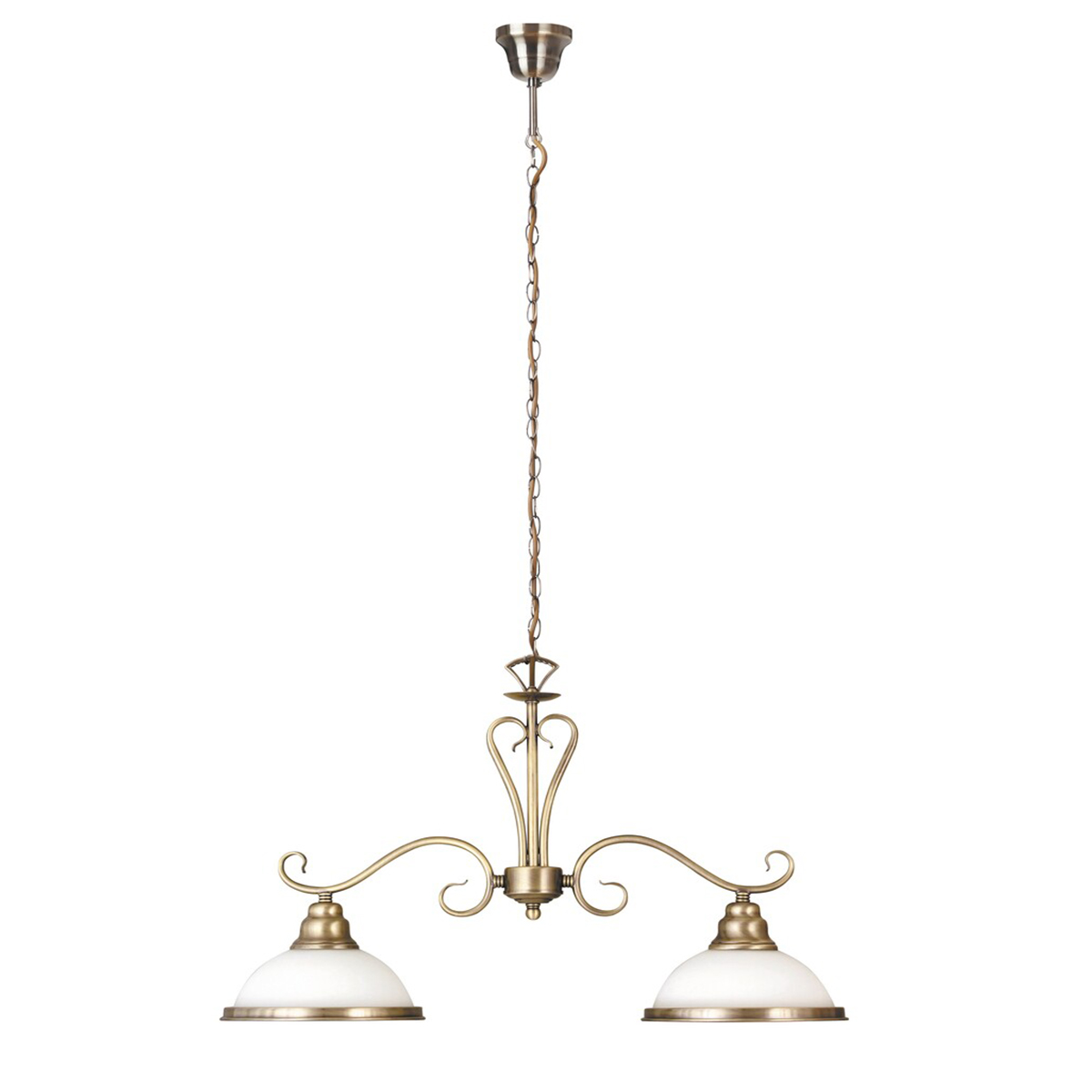 Visilica Elisett sa dva sijalična mesta, postolje od metala u boji mat bronze, abažur belo staklo. Izvor svetlosti: E27 2x MAX 60W. Dimenzije: 62x12 cm x110cm. Svetiljka se isporučuje bez izvora svetlosti.