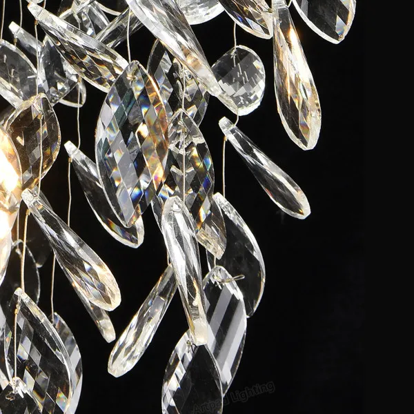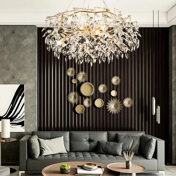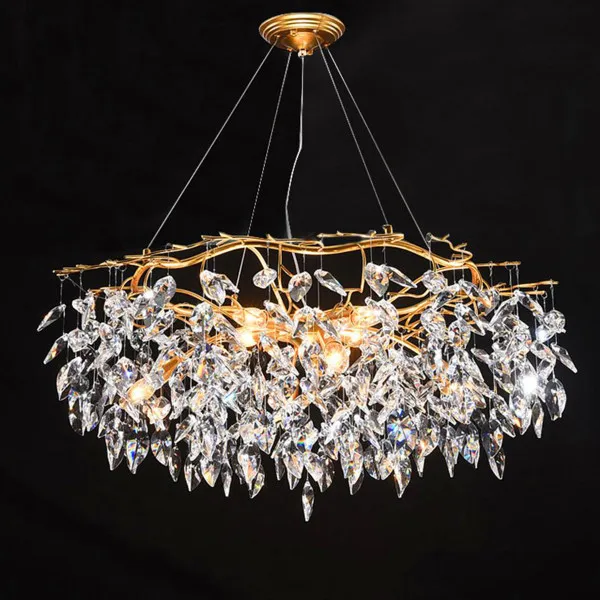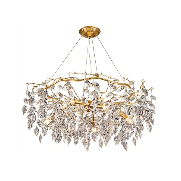 Kristalni luster, armatura od aluminijuma u boji zlata.Ukrasi od stakla u obliku listića, kačenje na sajlama.Sijalično grlo G9 za LED izvor svetlosti 10 x max. 6W , 220-240V . Svetiljka se isporučuje bez izvora svetlosti . Dimenzije : fi. 80 x H120 cm