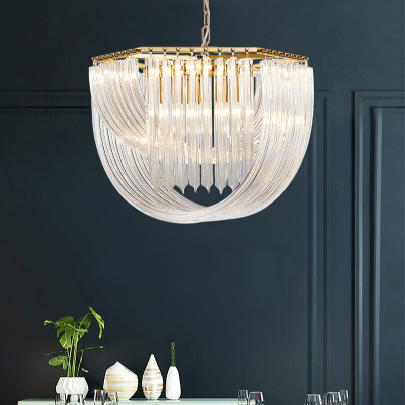 Luster napravljen od metala u boji poliranog zlata, difuzori od staklenih livenih elemenata providne boje. Sijalično grlo E14 za LED izvor svetlosti 6 x max. 6W, 220-240V. Svetiljka se isporučuje bez izvora svetlosti. Dimenzije: fi50 x H 110 cm.
