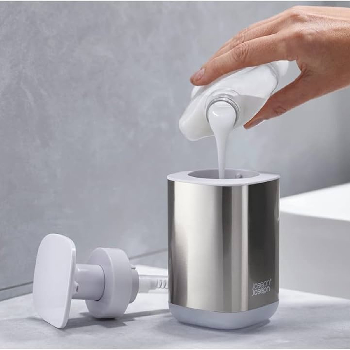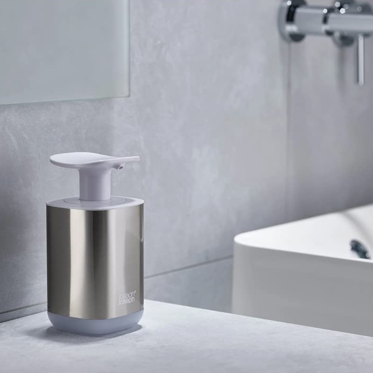 Velika glava pumpe laka za rukovanje. Gurnite zglobom za optimalnu higijenu. Prozirni prozor za proveru nivoa punjenja. Neklizajuca osnova. Pogodno za sve vrste tečnog sapuna za ruke. Kapacitet 350 ml.