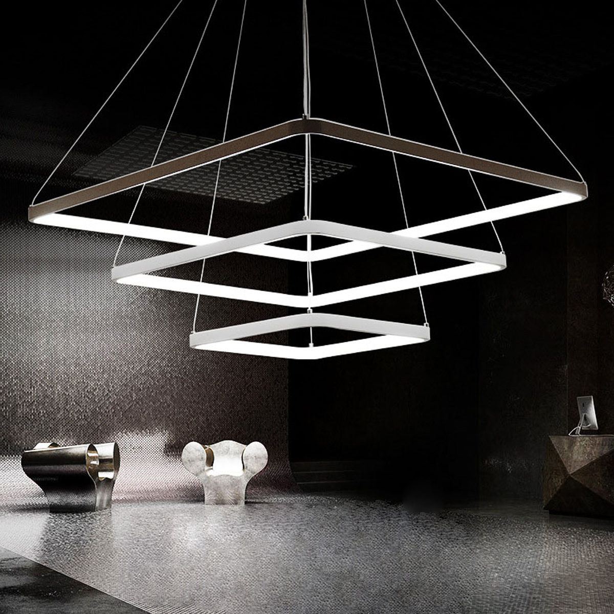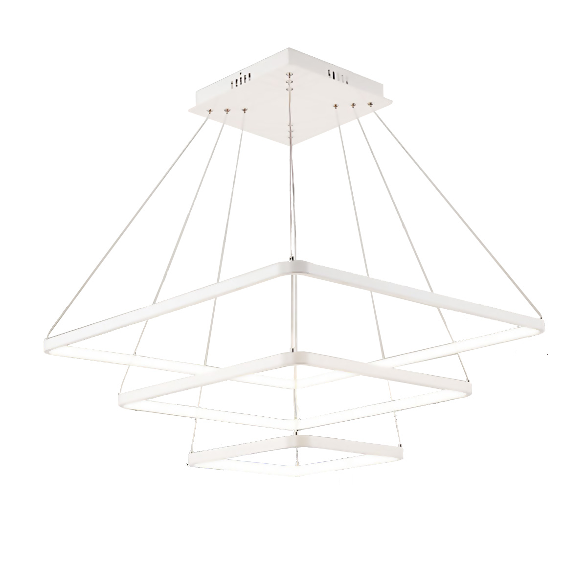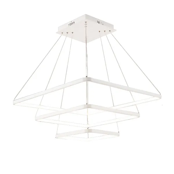 Led visilica sa tri kvadrata, od aluminijuma u beloj boji, difuzor od opal belog silikona. Integrisani LED izvor svetlosti 95W, toplo bele boje svetlosti 3000K. Dimenzije: dimenzija rozetne 27 x 27cm, dimenzije kvadrata 40x40 + 60x60 + 80x80 x H 150 cm
