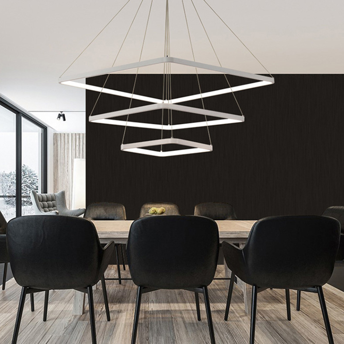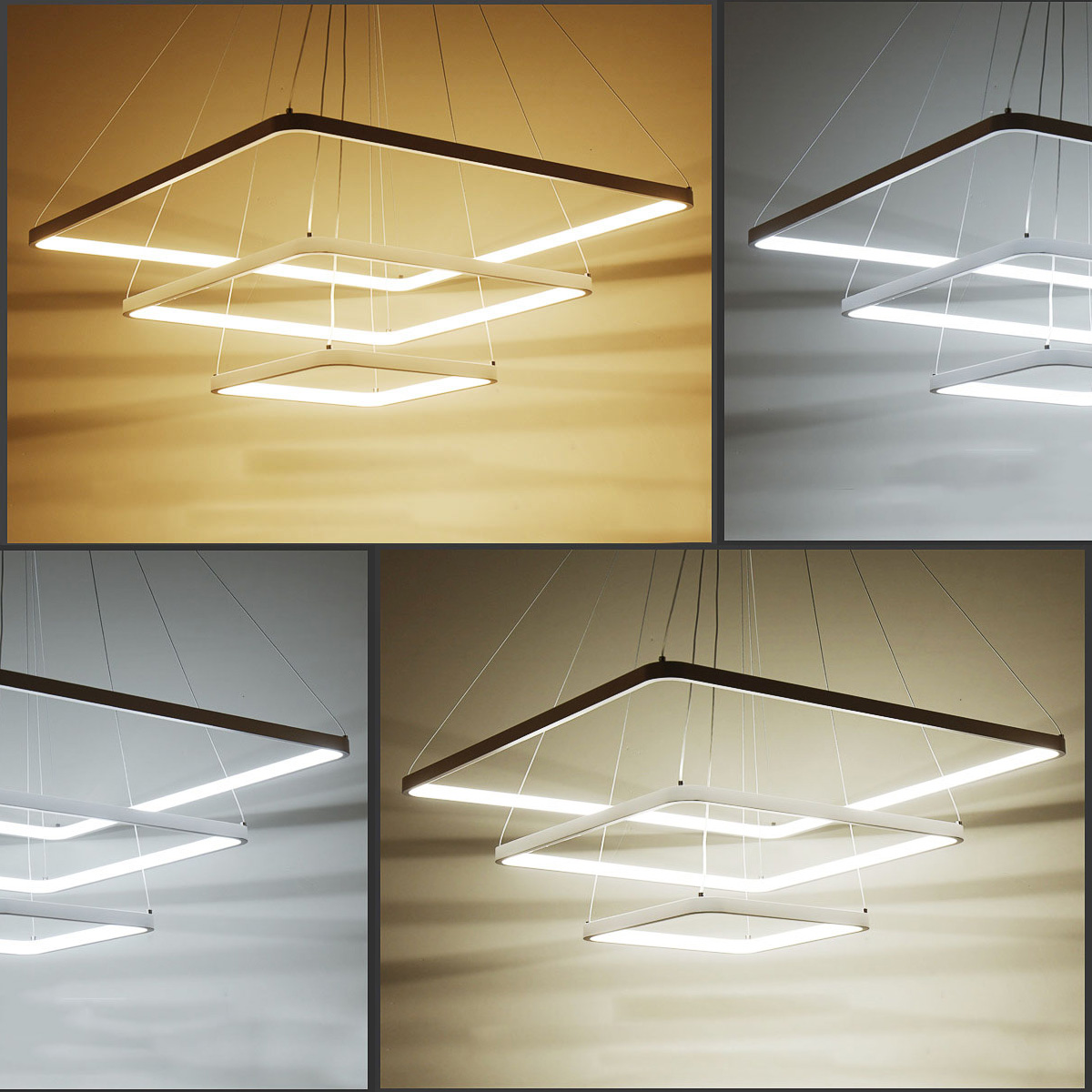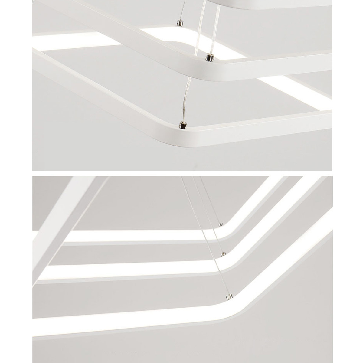 Led visilica sa tri kvadrata, od aluminijuma u beloj boji, difuzor od opal belog silikona. Integrisani LED izvor svetlosti 95W, toplo bele boje svetlosti 3000K. Dimenzije: dimenzija rozetne 27 x 27cm, dimenzije kvadrata 40x40 + 60x60 + 80x80 x H 150 cm