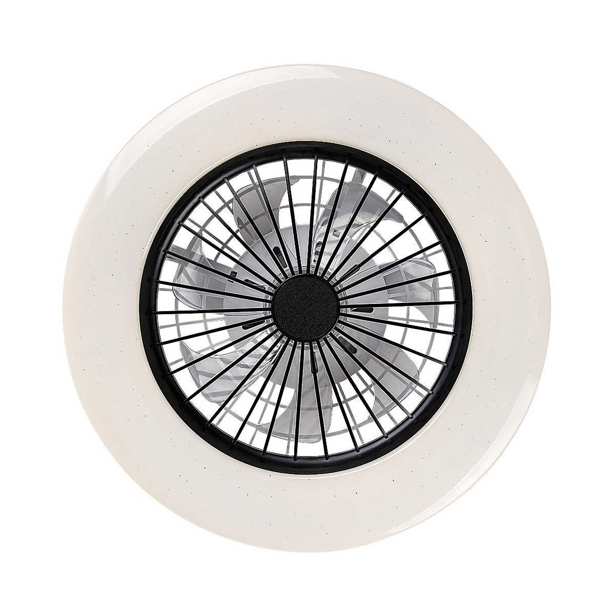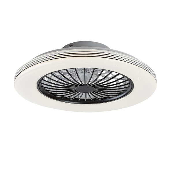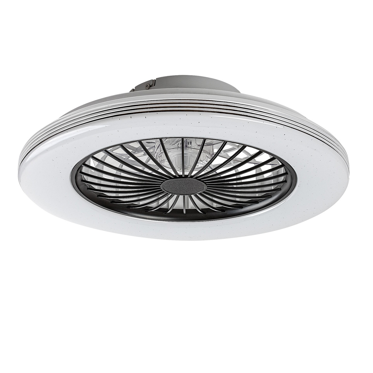 Plafonska lampa sa ventilatorom Dalfon 2 je idealan izbor za one koji traže svestrani model 2-u-1. Lampa ima ugrađen LED izvor svetlosti snage 48W, a pored ventilatora, nudi i druge funkcije pogodnosti: osvetljenost i temperaturu boje možete podešavati daljinskim upravljačem, a lampa takođe ima memoriju, tajmer i funkciju noćnog svetla. Temperatura boje može se podešavati i zidnim prekidačem. Kućište je izrađeno od metala i plastike u crnoj boji. Abažur je od bele plastike sa elegantnim efektom zvezdanog neba na površini. Brzina ventilatora je podesiva, a snaga je dovoljna za prostorije do 33 m. Pametna plafonska lampa sa ventilatorom karakteriše se energetski efikasnim radom i dugim vekom trajanja. Dimenzije:D:48,5 H:14cm