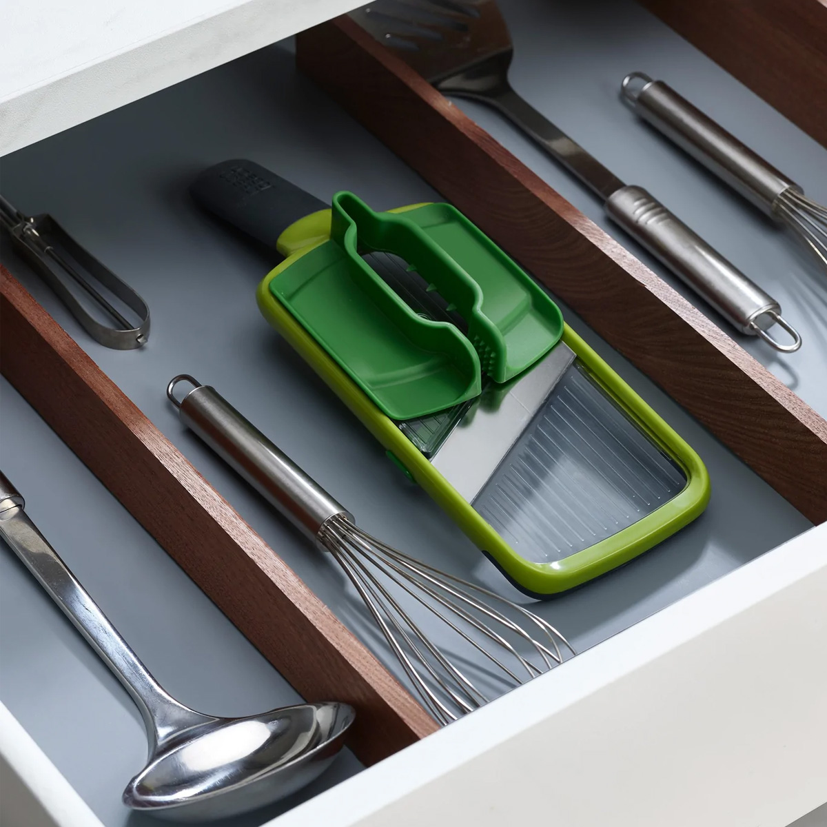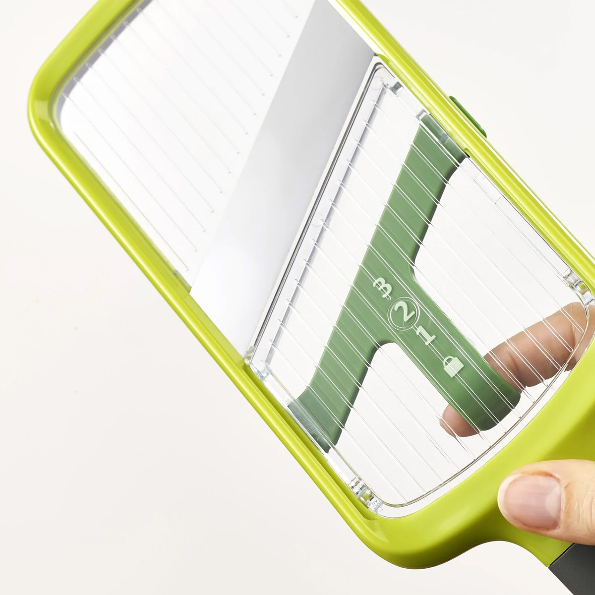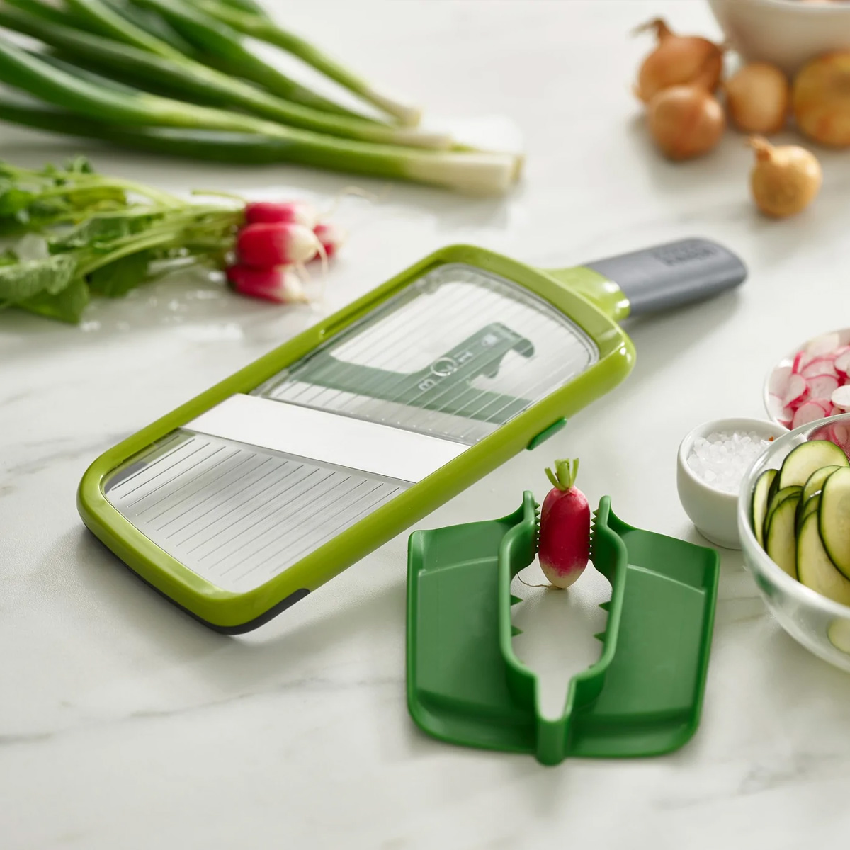 Bezbedno i ravnomerno narežite razno voce i povrce. Precizni rukohvat za hranu ima tri stila hvatanja: hvataljka za male predmete, centralni držač za okrugle kriške i ravan za duže kriške. Neklizajuci vrh i ručka koja se lako hvata. Štitnik drži prste dalje od sečiva. Pogodno za mašinsko pranje. Držite prste dalje od sečiva tokom upotrebe i čišcenja. Bez BPA. Dimenzije: 30 x 10 x 5,8 cm