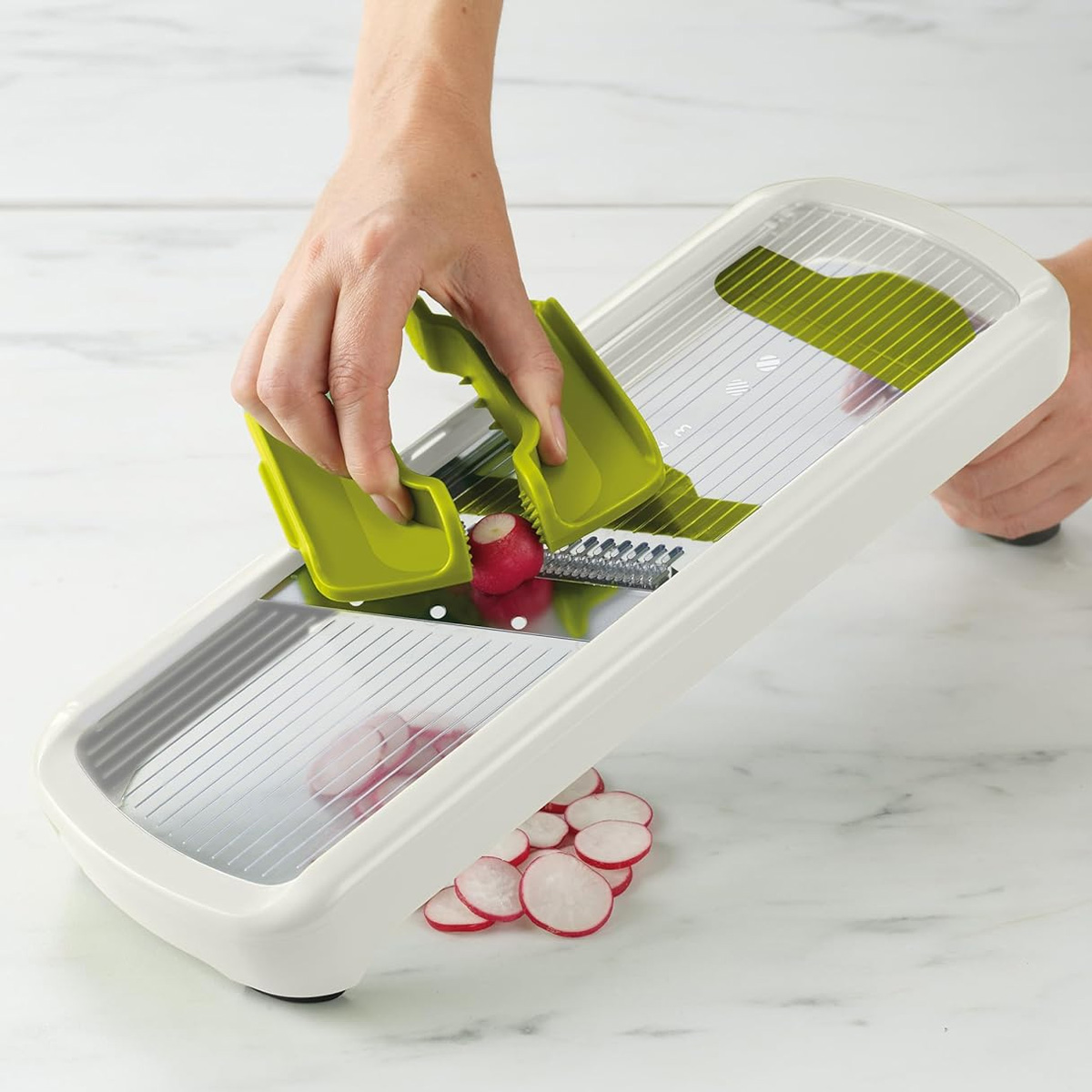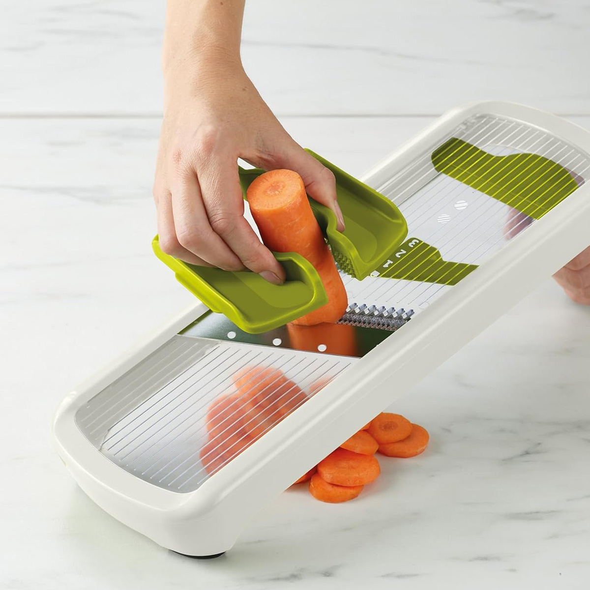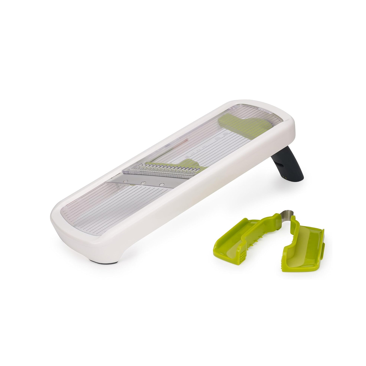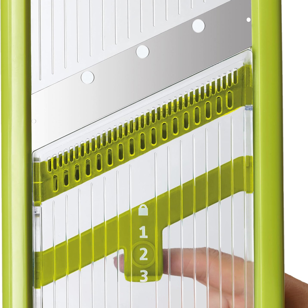 Bezbedno i ravnomerno narežite razno voće i povrće. Precizni držač za hranu štiti prste i ima tri načina držanja: hvataljka za male predmete; Centralni držač za okrugle kriške; Ravni hvat za duže rezove. Oštra sečiva od nerđajućeg čelika. Podesiva na tri debljine kriške i dve debljine žiliena. Noge protiv klizanja i sklopiva ručka. Dimenzija 38 x 14 x 13,5 cm.