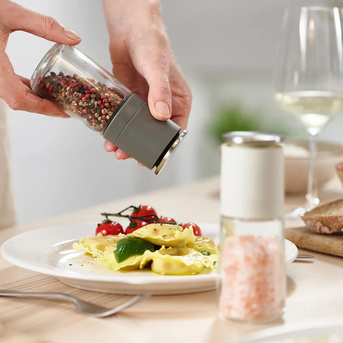 Inovativni obrnuti dizajn - ostaci taloga uredno padaju nazad u mlin, izbegavajući nered. Nežno okretanje osnove oslobađa idealnu količinu začina prilagođavajući ga od finog do krupnog mlevenja. Stakleno postolje se lako odvrće za brzo i čisto punjenje. Visokokvalitetni keramički mehanizam za mlevenje.