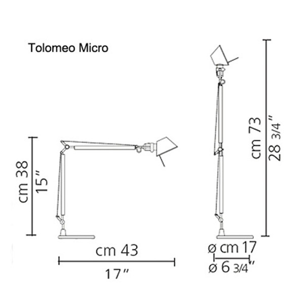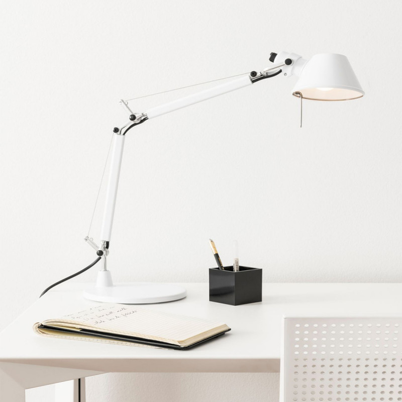 Stona lampa Tolomeo Micro je deo porodice stonih lampi Tolomeo. Tolomeo Micro nam dolazi sa bazom i podupirujućim telom od poliranog aluminijuma dok je difuzor izrađen od eloksiranog aluminijuma. Boja bela. Na standardno sijalično grlo E14 moguće je montirati i LED sijalicu, isporučuje se bez izvora svetla. Dim.45x37cm; max H 73cm; Dizajn lampe: Michele De Lucchi i Giancarlo Fassina.