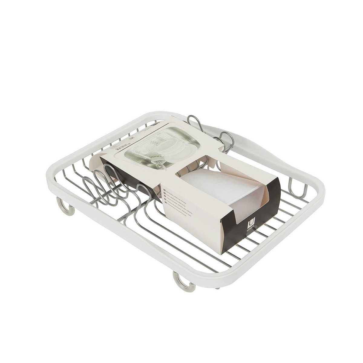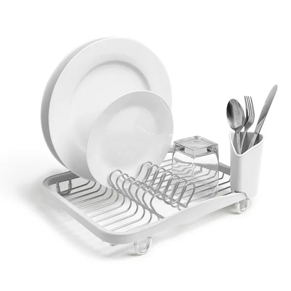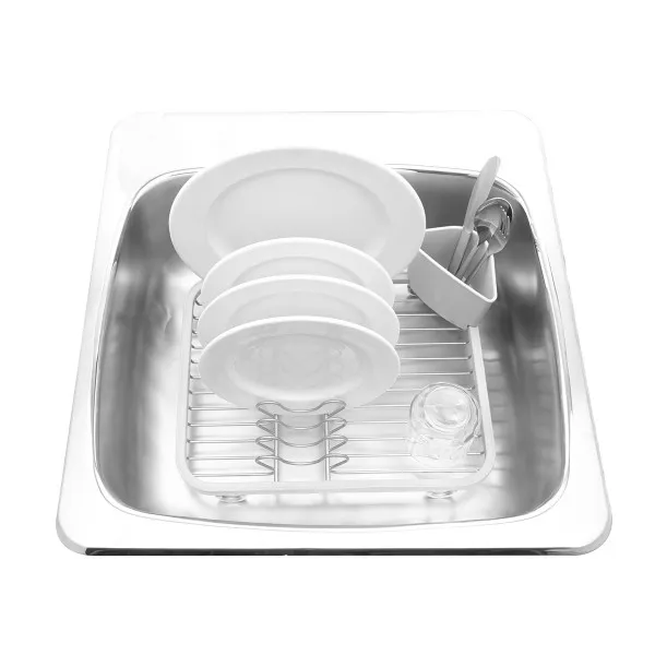 Oceđivač za sudove, kombinacija plastike bele boje i nerđajućeg čelika. Dimenzije: 35,6 x 27,9 x 14 cm.