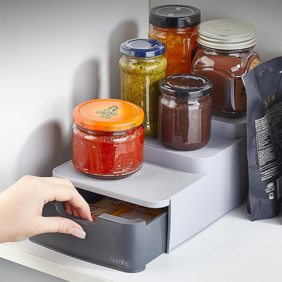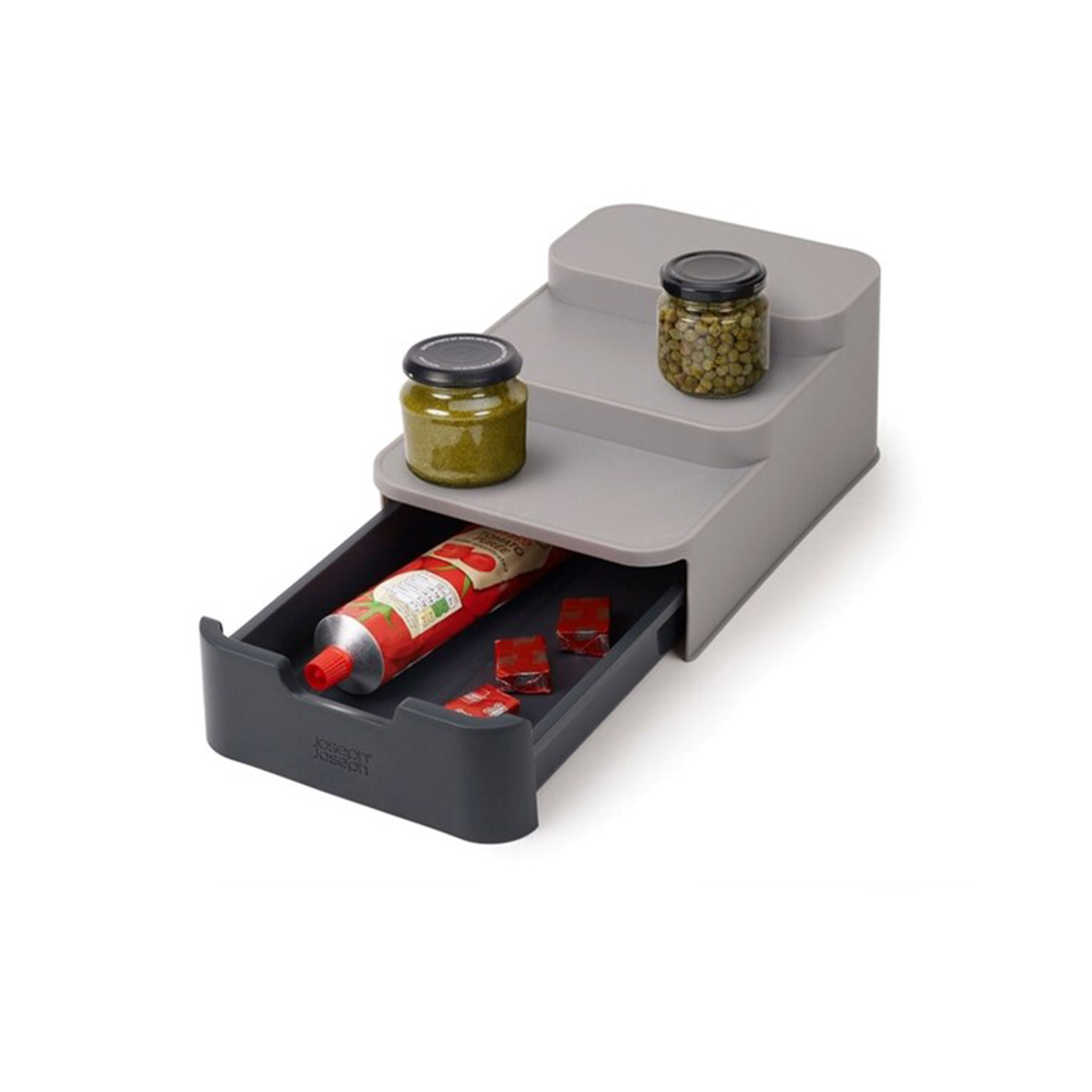Dizajn sa 3 nivoa poboljšava organizaciju, vidljivost i pristup kuhinjskim ormarima. Izvlačna fioka je savršena za odlaganje malih predmeta. Pogodno za police sa minimalnom dubinom od 26 cm.