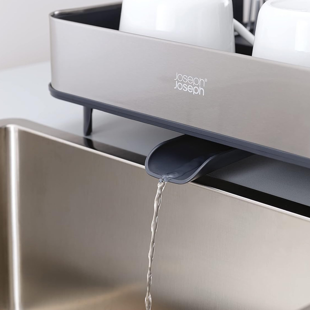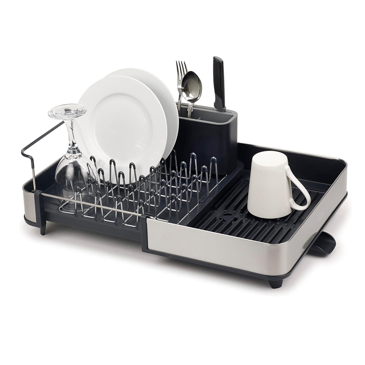 Stalak za sudove se može produžiti do skoro dvostruke veličine kako bi stalo više posuđa. Integrisani odliv odvodi višak vode i može se zatvoriti kako bi se voda zadržala unutra za kasnije pražnjenje. Platirani čelični zupci i obli vrhovi čine ga pogodnim za sve vrste staklenog posuđa. Čelični stalak se može ukloniti.
