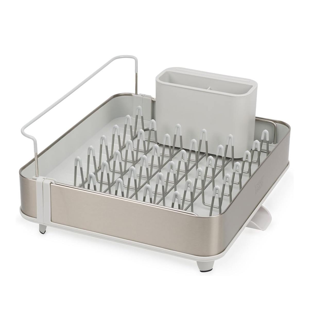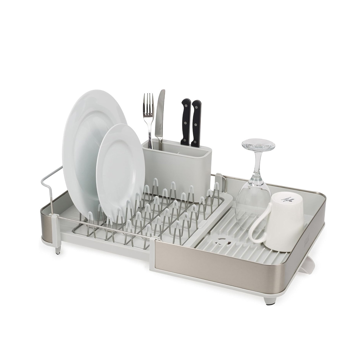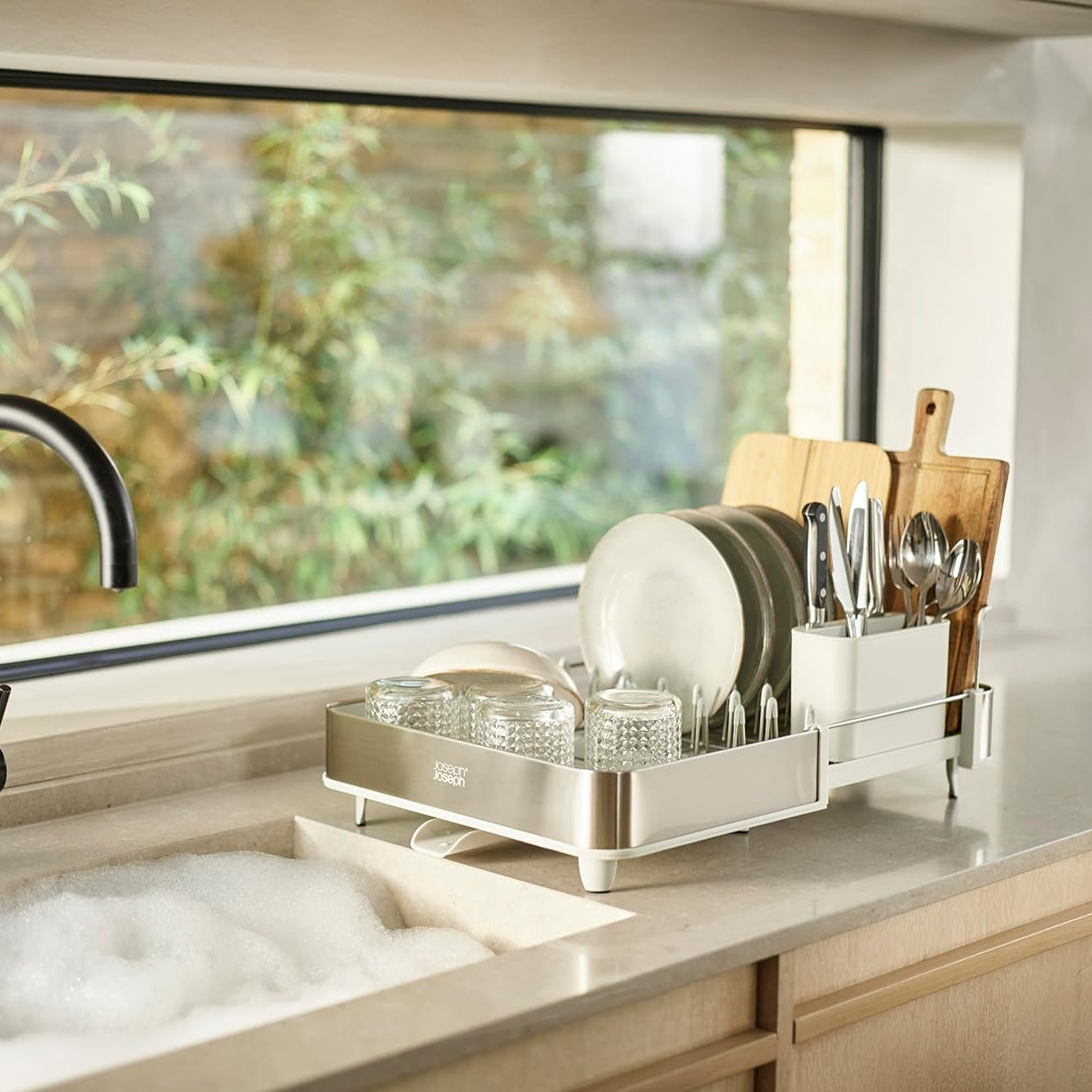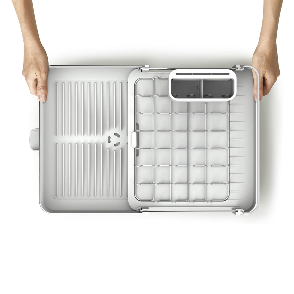 Proširuje se za držanje više predmeta kada je potrebno. Odvodni izliv sa tri različita položaja. Podignuta rebra sprečavaju da se voda zarobi ispod čaša i činija. Vodilice za drenažu i dasku za sečenje otporne na ogrebotine. Pokretni oceđivač za pribor za jelo sa otvorima za noževe. Završna obrada od nerđajućeg čelika sa premazom otpornim na otiske prstiju. Dimenzije: 31,5 x 36 x 16 cm