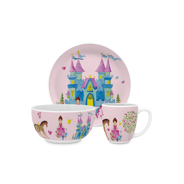Dečiji set Princess koji se sastoji od šolje,činije i tanjira. Napravljen od New Bone China u roze boji sa detaljima. Fi. Činije 12cm, fi. Tanjira 21cm. Zapremina šolje 0,25L. Može se koristiti u mikrotalasnoj rerni. Održavanje: Može se prati u mašini za sudove.