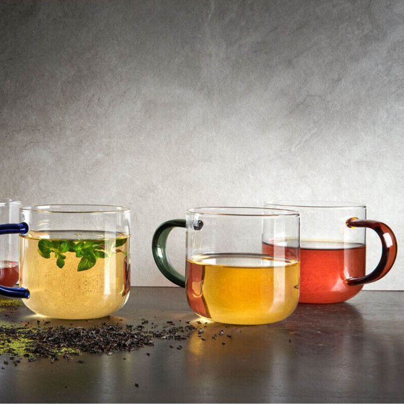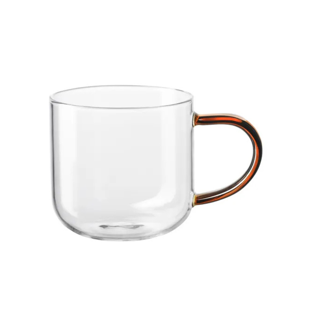 Šolja napravljena od borosilicate stakla, sa braon ručkom. Dimenzije; d. 9 cm, h. 9,1 cm, 0,4 l. Napomena; može se prati u mašini za sudove.