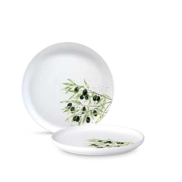 Tanjir bele boje sa detaljem maslinove grane, napravljen od materijala New Bone China. Dimenzije:27 x 27 x H2cm. Napomena: Moze se stavljati u mikrotalasnu rernu I moze se prati u masini za sudove.