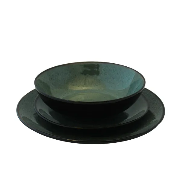 Keramički tanjir zelene boje iznutra , crna boja spolja. Dimenzija fi. 28cm. Može da se pere u mašini za sudove.