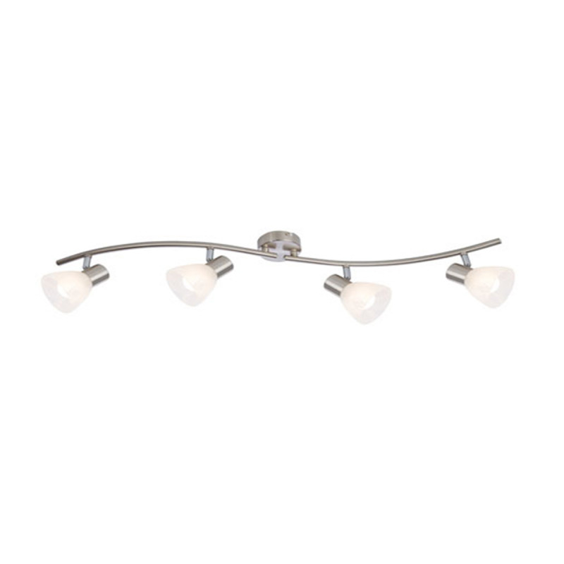Spot lampa na šini od metala u mat hromu i difuzora od belog stakla. Izvor svetlosti: 4 x E14 40W. Dimenzije: 80 x 8,3 x 14,5cm.