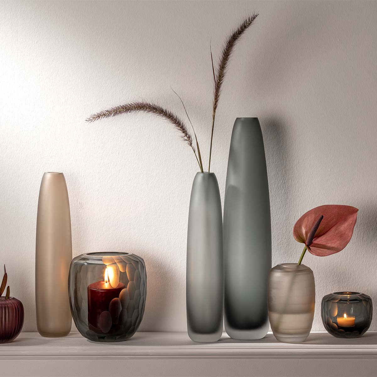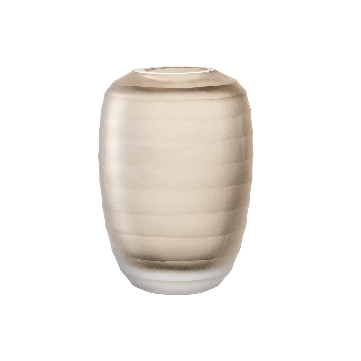 Vaza ovalnog oblika, prozirno bež boje od stakla.Održavanje: ručno pranje. Dimenzije: H16,2xD10cm
